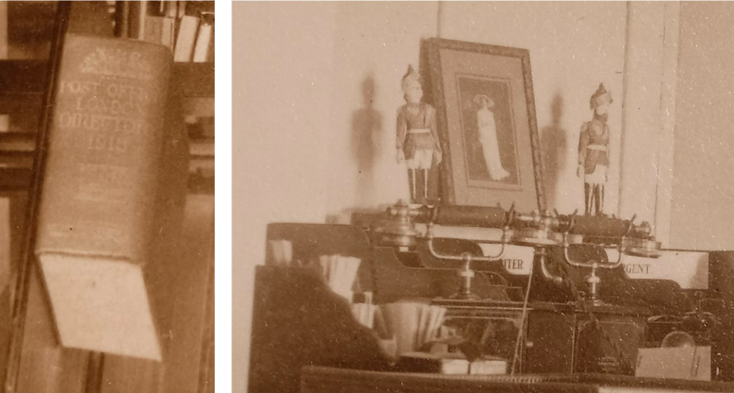 Look carefully to the left of the longcase clock, in the top photograph. There is a lectern beneath two electric sockets, each with voltmeters and probably installed within the previous decade; on it you will see copies of the Madras Mail and Madras Times — perhaps on that very day, the 9th September, and certainly close to it. Unfortunately neither their dates nor headlines are legible, but the sign below the longcase clock states clearly: “Madras War Fund, for sale, Rs250”.3 So the war carried on. In the second photograph, on its side in a bookshelf, we can see a fat Post Office London Directory 1918. We can date the photograph to no earlier than June 1918 (when Collingridge returned from Basra) and probably no later than November or December 1918, adjacent to the Armistice of 11th November 1918. The backstop is 31 March 1919, when the Military Secretary and his father (an indigo planter from Muzzafarpur) returned to London with the Governor of Madras, Lord Pentland, and his family in first class cabins aboard the SS Chindwara.